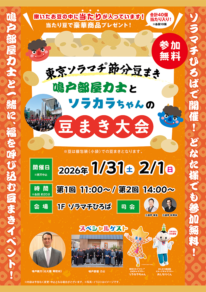 鳴戸親方(元大関琴欧洲)と鳴戸部屋の力士、東京スカイツリー公式キャラクター ソラカラちゃんや地元おしなり商店街のイメージキャラクター おしなりくんが参加する豆まき式を実施いたします。