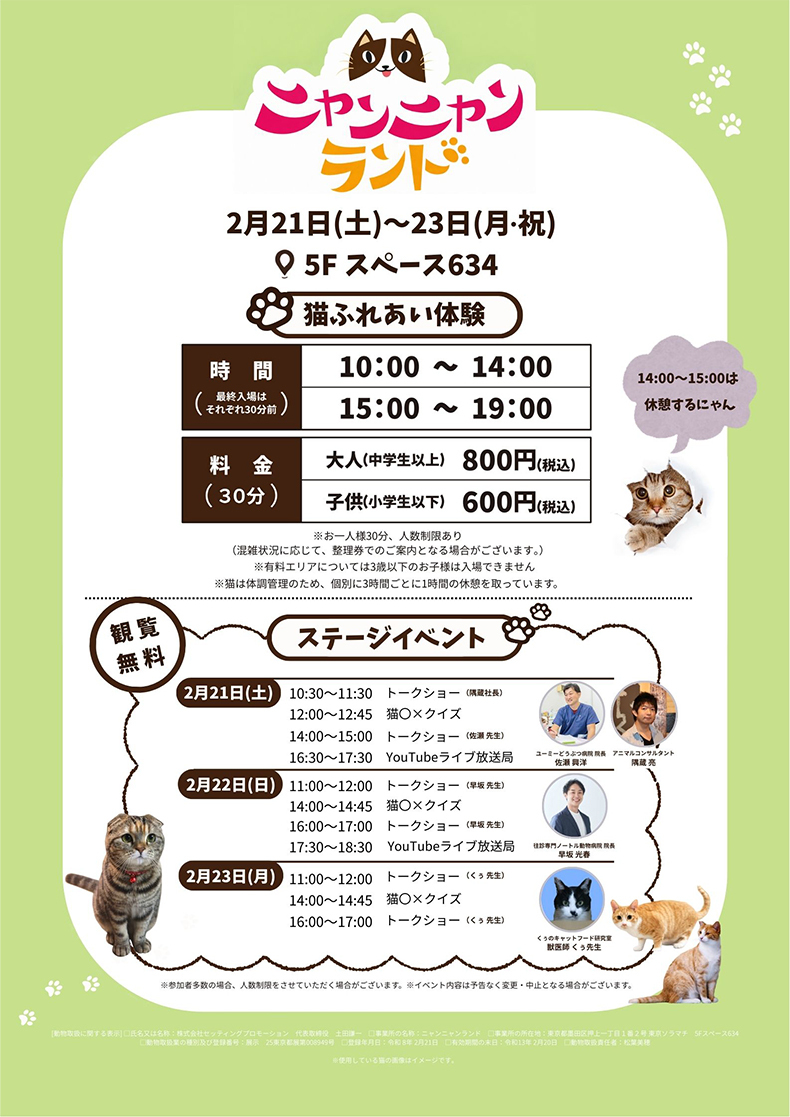 氏名又は名称:株式会社セッティングプロモーション 代表取締役 土田謙一/事業所の名称:ニャンニャンランド/事業所の所在地:東京都墨田区押上一丁目1番2号 東京ソラマチ 5Fスペース634/動物取扱業の種別及び登録番号:展示 25東京都展第008949号/登録年月日:令和 8年 2月21日/有効期間の末日:令和13年 2月20日/動物取扱責任者:松葉美穂