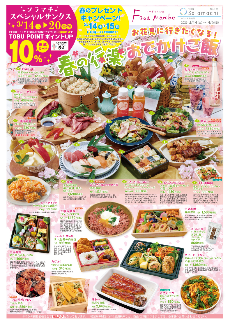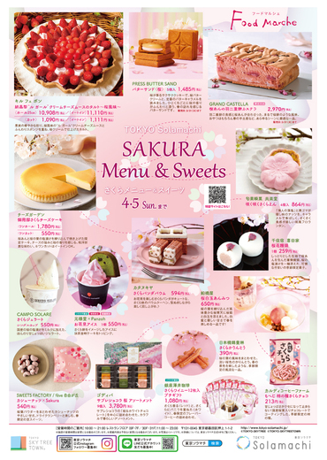 東京ソラマチ「フードマルシェ」では、3/14(土)~3/20(金)のスペシャルサンクス期間にあわせて、3/14(土)より「春の行楽/さくらメニュー&スイーツ」を展開いたします!