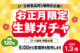 イベント/グルメ2F生鮮食品売り場特別企画!! 「お正月限定 生鮮ガチャ」2026年1月3日 ~ 2026年1月3日 -