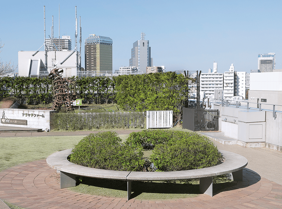 とうきょうスカイツリー駅からのソラマチへの玄関口“ハナミ坂”近くにあるスペース。フードマルシェも近いので、お気に入りのテイクアウトフードを楽しんで。
