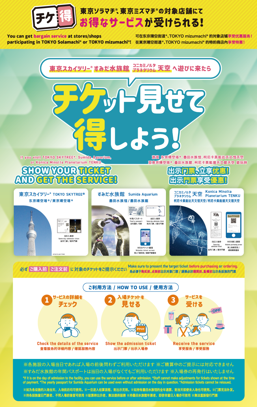 東京スカイツリーチケットまたはすみだ水族館チケット提示で天空鑑賞料金が10%割引!※チケット提示で1名様1上映まで/天空チケット提示は対象外/他の割引併用不可 /三日月シートは除く/作品によっては鑑賞の年齢制限が有り -