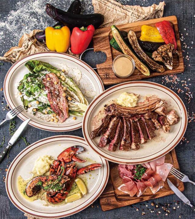 700度の高温オーブンで焼き上げたリブアイステーキや直火焼きのグリル野菜