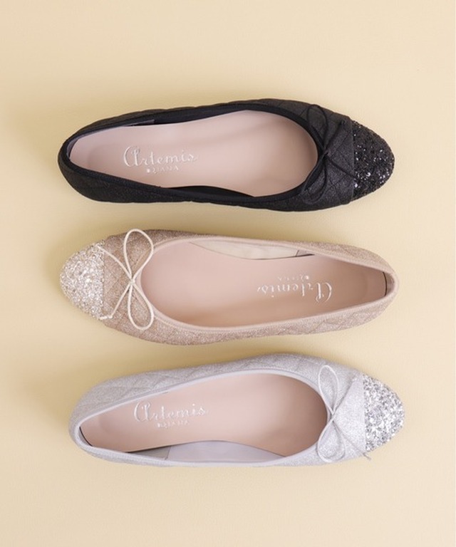 ラメをキルティング加工したオリジナル素材と、同系色の大粒グリッターの組み合わせが華やかなバレエシューズ。